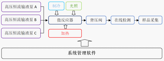 如圖所示,物料通過高壓輸液泵輸送到微反應(yīng)器中,在高壓密閉的微通道管路中,通過溫度控制,,使合成反應(yīng)能夠快速完成并極大提高收率,背壓閥能夠人為控制反應(yīng)器內(nèi)壓力,物料在出口處通過在線檢測器檢測合成結(jié)果,經(jīng)過檢測后的產(chǎn)品可通過樣品采集器按預(yù)設(shè)的收集條件收集到不同的容器中。整個反應(yīng)系統(tǒng)可通過管理軟件實(shí)現(xiàn)自動控制,具有方法建立、模塊搭建、模塊參數(shù)設(shè)置,全反應(yīng)過程參數(shù)實(shí)時監(jiān)控,數(shù)據(jù)追溯,用戶管理及智能專家數(shù)據(jù)庫等功能,專用管理軟件可將整個反應(yīng)體系效率發(fā)揮到極致。