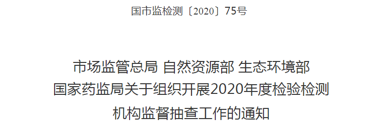 2020年5月14日,市場(chǎng)監(jiān)管總局、自然資源部、生態(tài)環(huán)境部、國(guó)家藥監(jiān)局聯(lián)合發(fā)布了《關(guān)于組織開(kāi)展2020年度檢驗(yàn)檢測(cè)機(jī)構(gòu)監(jiān)督抽查工作的通知》。通知顯示,為加強(qiáng)檢驗(yàn)檢測(cè)機(jī)構(gòu)監(jiān)管,營(yíng)造公平有序的市場(chǎng)環(huán)境,為疫情防控和經(jīng)濟(jì)社會(huì)發(fā)展提供技術(shù)支撐,市場(chǎng)監(jiān)管總局、自然資源部、生態(tài)環(huán)境部和國(guó)家藥監(jiān)局決定于2020年6月至10月在全國(guó)范圍內(nèi)組織開(kāi)展檢驗(yàn)檢測(cè)機(jī)構(gòu)“雙隨機(jī)、一公開(kāi)”監(jiān)督抽查。