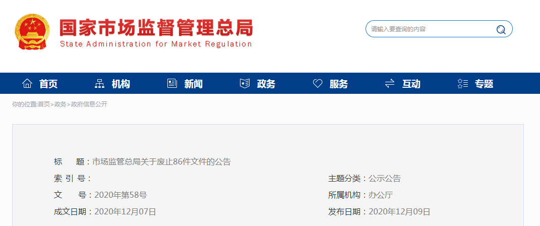市場(chǎng)監(jiān)管總局關(guān)于廢止86件文件的公告