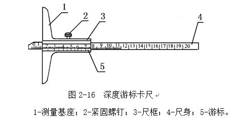 深度游標(biāo)卡尺如圖2-16所示,用于測(cè)量零件的深度尺寸或臺(tái)階高低和槽的深度。它的結(jié)構(gòu)特點(diǎn)是尺框3的兩個(gè)量爪連成一起成為一個(gè)帶游標(biāo)測(cè)量基座1,基座的端面和尺身4的端面就是它的兩個(gè)測(cè)量面。如測(cè)量?jī)?nèi)孔深度時(shí)應(yīng)把基座的端面緊靠在被測(cè)孔的端面上,使尺身與被測(cè)孔的中心線平行,伸入尺身,則尺身端面至基座端面之間的距離,就是被測(cè)零件的深度尺寸。它的讀數(shù)方法和游標(biāo)卡尺完全一樣。