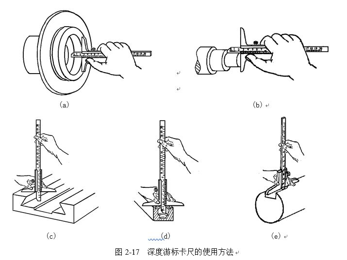 測(cè)量時(shí),先把測(cè)量基座輕輕壓在工件的基準(zhǔn)面上,兩個(gè)端面必須接觸工件的基準(zhǔn)面,圖2-17(a) 所示。測(cè)量軸類(lèi)等臺(tái)階時(shí),測(cè)量基座的端面一定要壓緊在基準(zhǔn)面,圖2-17(b)(c) 所示,再移動(dòng)尺身,直到尺身的端面接觸到工件的量面(臺(tái)階面)上,然后用緊固螺釘固定尺框,提起卡尺,讀出深度尺寸。多臺(tái)階小直徑的內(nèi)孔深度測(cè)量,要注意尺身的端面是否在要測(cè)量的臺(tái)階上,圖2-17(d) 。當(dāng)基準(zhǔn)面是曲線時(shí),圖2-17(e) ,測(cè)量基座的端面必須放在曲線的最高點(diǎn)上,測(cè)量出的深度尺寸才是工件的實(shí)際尺寸,否則會(huì)出現(xiàn)測(cè)量誤差。